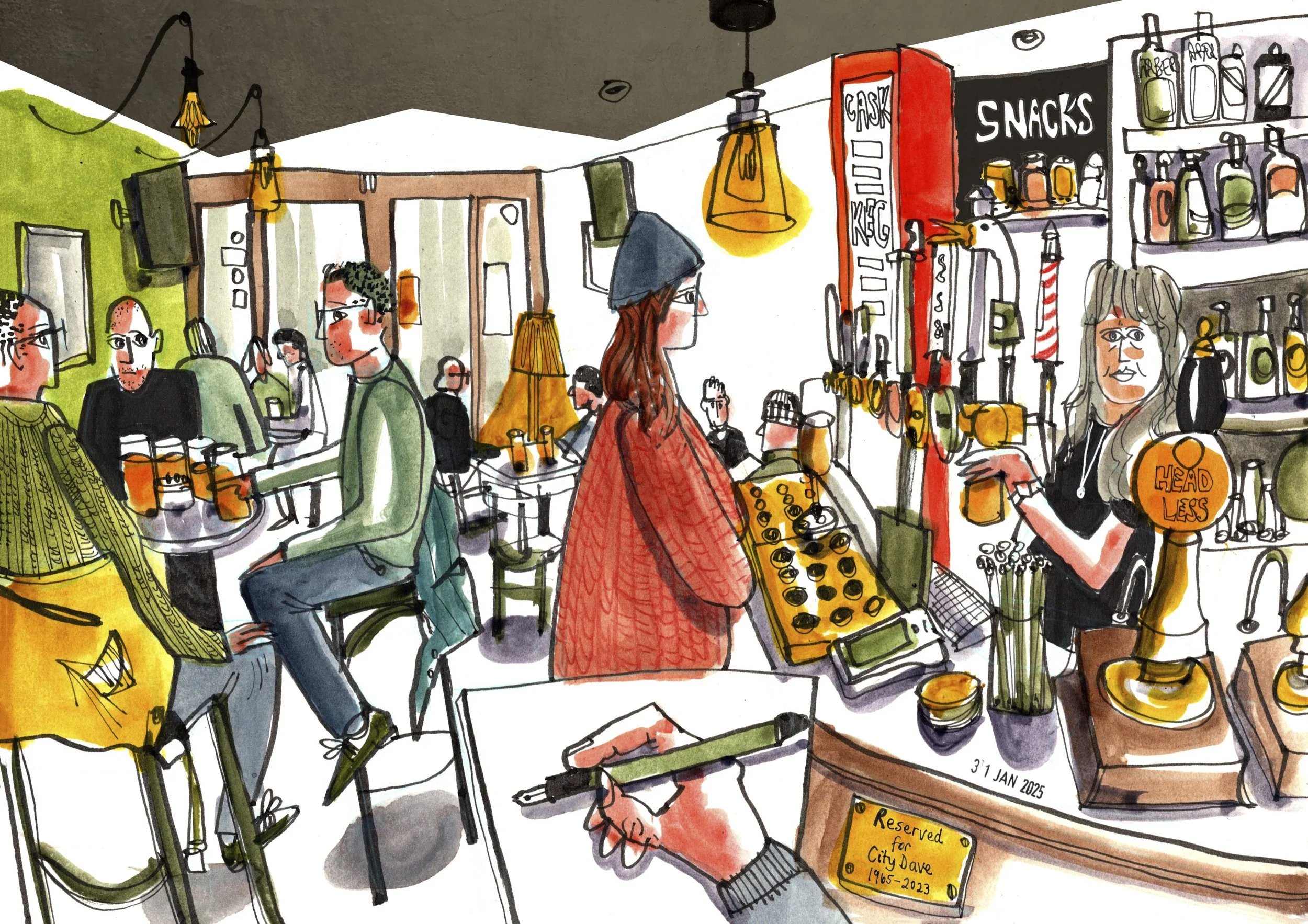 I’ve ditched the camera. Now I draw and write to make a living. Over the last few years I’ve published sketchbooks of Manchester neighbourhoods. First, Rusholme. Then West Didsbury and Withington. Last year I made a book about the Northern Quarter, and I called it Bars and Barbers because there are loads of both there. My fourth book, about Chorlton, will come out later this year.